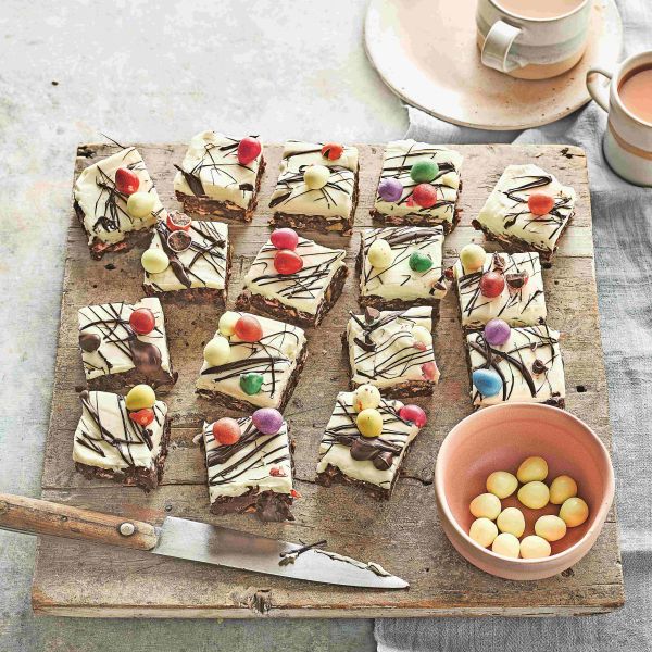 Preostalih 25 g nalomljene temne čokolade damo v nepregorno skledico in jo stopimo na kozici, v kateri nežno vre voda, ali v mikrovalovni pečici v 20-sekundnih intervalih. Stopljeno čokolado pokapamo po sladici, nato pa takoj posujemo z mini čokoladnimi jajčki. Narežemo na kocke in postrežemo. V hladilniku se obdrži do 3 dni.