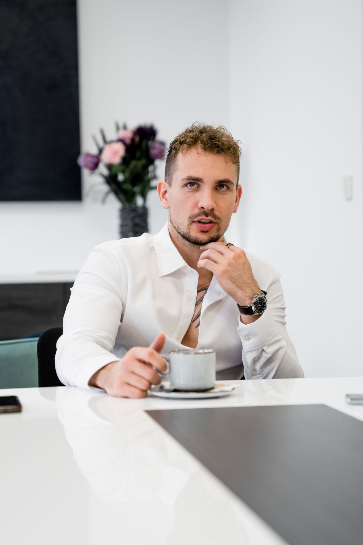 Medtem ko klasično zapeta srajca pogosto deluje formalno in zadržano, nekoliko bolj odprt ovratnik ustvari občutek sproščenosti. Prav to ravnotežje med urejenostjo in lahkotnostjo je tisto, kar njegov slog naredi prepoznaven in sodoben.
